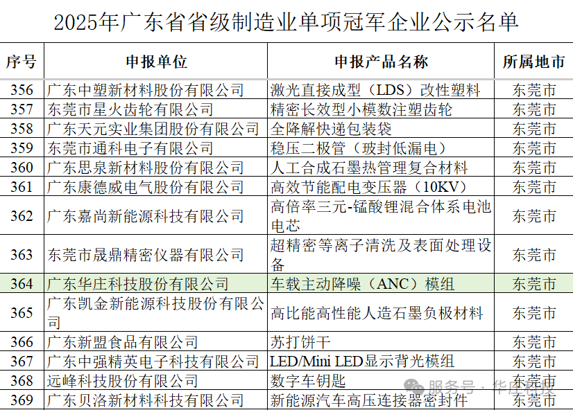 2026年1月9日,广东省制造业高质量发展领域再添喜讯:广东华庄科技股份有限公司(以下简称“广东华庄”)的“车载主动降噪(ANC)模组”,成功获评2025年广东省省级制造业单项冠军。这一荣誉由广东省工业和信息化厅依据严格遴选标准认定,标志着广东华庄在车载主动降噪领域已跻身省级标杆列。
